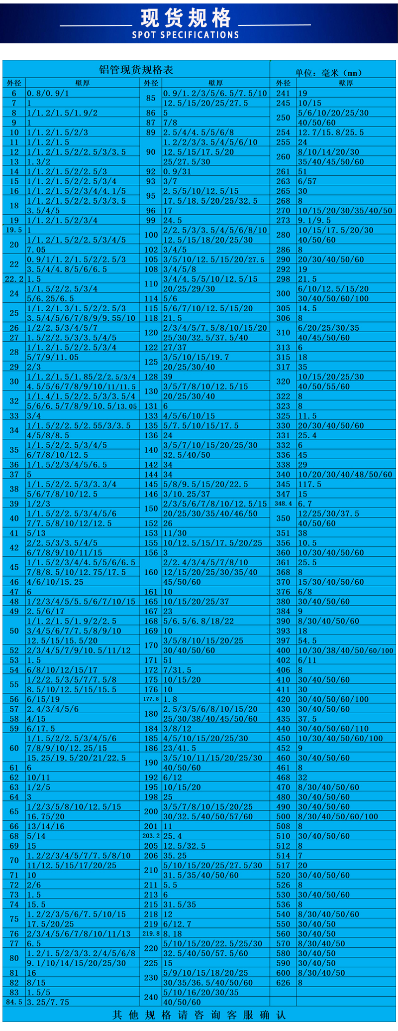 聚金鑫(上海)鋁業有限公司主要經營無縫鋁管,鍛造鋁管,擠壓鋁管,鋁合金棒,鋁方棒,鋁排 5754鋁管_5182鋁管_鍛造鋁圓片_鍛造鋁管_6082鋁管_7075鋁棒 鋁管 鋁方管 無縫鋁管 厚壁鋁管 鋁板 鋁卷 鋁棒 鋁排 角鋁 鋁型材等有色金屬,所售產品均執行鋁材行業標準,有鋁型材擠壓生產線5條,噴涂、氧化生產線3條,配有CNC加工中心,以品質保障、現貨規格多樣、效率高來滿足不同客戶需求,所售鋁型材主要應用于零部件制造業、工程、煤礦、電力、汽車工業、建筑裝飾、能源化工、船舶制造業、機械工程、儀器設備、航空航天等行業。公司始終堅持為客戶提供品質保障的鋁材作為企業發展的根本,并為客戶提供系統的鋁材產品解決方案,以周到細致的服務回報廣大客戶. 主營產品材質有:6063(T6普遍的合金材質應用廣泛) 6061(T4硬鋁管) 2A12(LY12多為無縫鋁管) 3A21(防銹硬鋁) 6005(厚壁鋁管) 7075(t5 T6航空鋁管) 5052(5056 5083海洋用鋁管) 1060(1050 1100純鋁管 多為鑄鋁管) 有縫鋁管規格 直徑4mm-506mm 壁厚0.7mm-50mm(材質基本為6063 6061 6005焊接性能好,硬度一般,應用多。 鍛打鋁管規格 直徑8mm-260mm 壁厚1mm-25mm(材質全部為2024 也習慣稱之為LY12 或者2A12 硬度高 制作工藝為硬鋁棒穿孔) 防銹鋁管規格 直徑10mm-300mm 壁厚1mm-30mm(5系鋁管 有縫,多數用于輪船,游輪,汽艇上)7075現貨 直徑16mm-185mm 壁厚2mm-16mm(7075材質多數為飛行器使用、其特點 密度低 質量輕,硬度高于普通合金1.5-2倍!但是其價格也比同等規格的鋁管高了接近120%,所以價格決定了7075的鋁管多數用在較為貴、精密的設備上面)